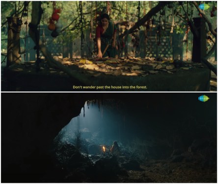 Sahadev’s direction supports this effective mise-en-scène even when his screenplay doesn’t. Camerawork is most always motion-controlled, dollied, or locked on a tripod, so the film’s overall look has a more professional feel than it’s limited budget might otherwise imply. In terms of writing, however, the film is much less consistent, particularly outside Lekshmi’s lead and Chacko’s male love-interest/antagonist. Even the movie’s enticing mythology, first teased in its opening scene (see below) loses some of its luster once the ultimate mystery behind Lekshmi’s in-law family history is revealed, though a strong ending picks up some of that slack.