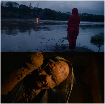 Top: The protagonist’s mother, Jyoti Malshe, observes the cremation of her village patriarch toward the end of the first act. Bottom: Piyush Kaushik, under heavy makeup, demonstrates the consequences of Tumbbad’s diegetic curse.