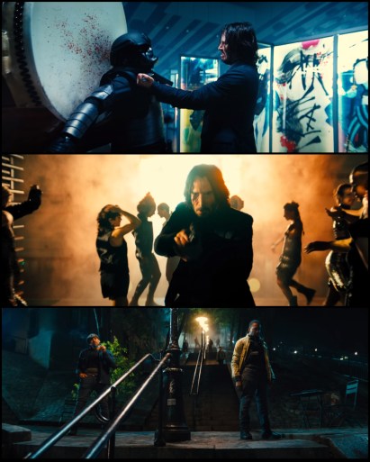 Top: Reeves counters shock trooper body armor with up-close and personal ballistics in the Osaka Continental. Middle: Reeves pursues a high ranking crime boss through the colorful architecture of a Berlin nightclub. Bottom: At least a dozen assassins await Reeves at the steps below the Sacré-Cœur in JW4’s finale.