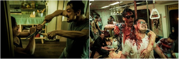 Violence abounds in The Sadness as lead Berant Zhu fends off an infected next-door neighbor (left) and his girlfriend, Regina Lei, flees from a subway massacre (right).
