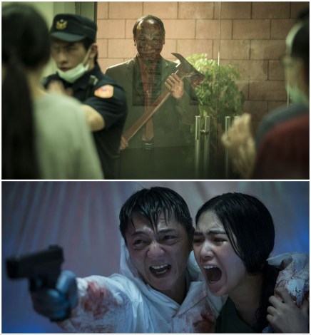 Top: Tzu-Chiang Wang stars as a disgruntled, lonely businessman whose most hideous impulses are unleashed by a novel virus. Bottom: Lei and supporting actor Wei-Hua Lan attempt to fend off infected with the latter’s 3D-printed handgun.