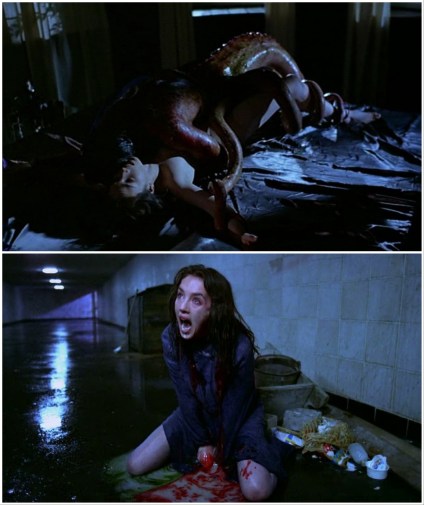 Top: Adjani copulates with some kind of Lovecraftian monstrosity in my favorite scene of the movie. Bottom: In one of my least favorite scenes of Possession, Adjani vomits, destroys her groceries and miscarries a metaphorical representation of “faith,” or something.