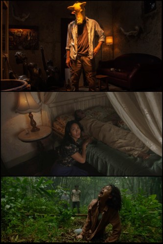 Creepy pig masks (top), tormented mothers (middle), and violent kidnapping (bottom) abound in The Forbidden Door, Satan’s Slaves, and Impetigore, respectively.