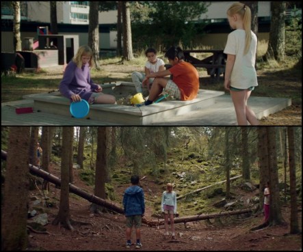 On the cinematographic front, The Innocents sports one of the highest key (i.e. lowest contrast), most softly lit visual styles of any movie I’ve watched. The look of the film could almost be described as anti-film noir given its sheer absence of harsh shadows, overwhelming pastel colors, and predominance of daytime sequences set during the Nordic summer. Maybe this dovetails with the environments to which most younger children are restricted given nighttime curfews, limited free time during the colder schoolyear, and community parks friendly to families, so altogether the film looks as bright-eyed and bushytailed as its principal characters.