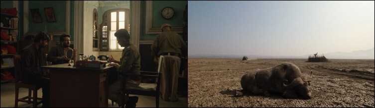 Left: Though not as flashy as the outdoor daytime photography, Thar’s indoor set-design leaves a mark thanks to great mise-en-scène composition. Right: Recurring shots of a decaying buffalo carcass mark the passage of time in the film.