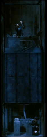 Near the end of the film, To showcases the vertical blocking of his actors inside an elevator shaft.