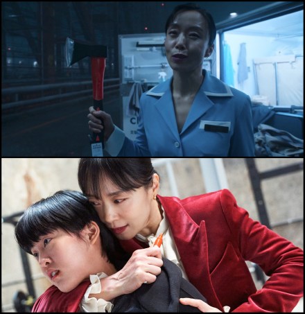Top: Lead Jeon Do-yeon compares her consumer-grade hatchet to the centuries’ old wakizashi used by her yakuza target, Hwang Jung-min (not pictured) in Kill Boksoon’s fun prologue. Bottom: A relationship that feels severely underused in Booksoon is that between Jeon and her assassin’s guild’s “star intern,” Lee Yeon (left).