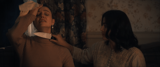 Wamiqa Gabbi (right), perhaps the worst performer in Khufiya, awkwardly holds an American spy’s wife (Monica Rae) hostage in one of the movie’s goofier scenes.