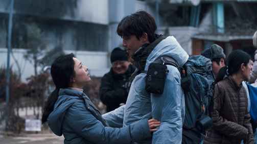 Park Bo-young bids a temporary farewell to her diegetic husband, Park Seo-joon, the latter of whom leaves on an expedition for supplies in Concrete Utopia.