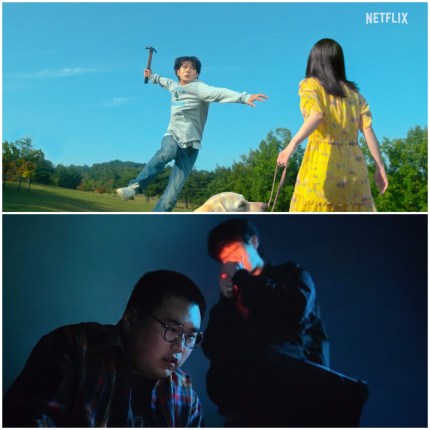 Lead Choi Woo-shik of A Killer Paradox demonstrates his vengeful side in a darkly comedic metaphorical sequence (top), but that emotional rage is tempered once he encounters Kim Yo-han’s corny stereotype (bottom) in the latter half of the series.