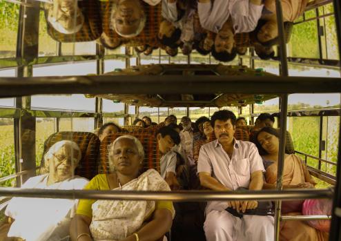 In a nice visualization of Nanpakal Nerathu Mayakkam’s themes of duality and identity, a tour bus’ glass reflects the image of our main cast of passengers (note lead Mammootty in white at center right in the foreground).