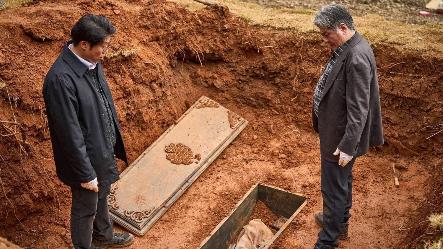 Mortician Yoo Hae-jin (left) and renowned Feng shui geomancer Choi Min-sik (right) examine an excavated grave in Act One prior to their contact with the rest of the main cast.