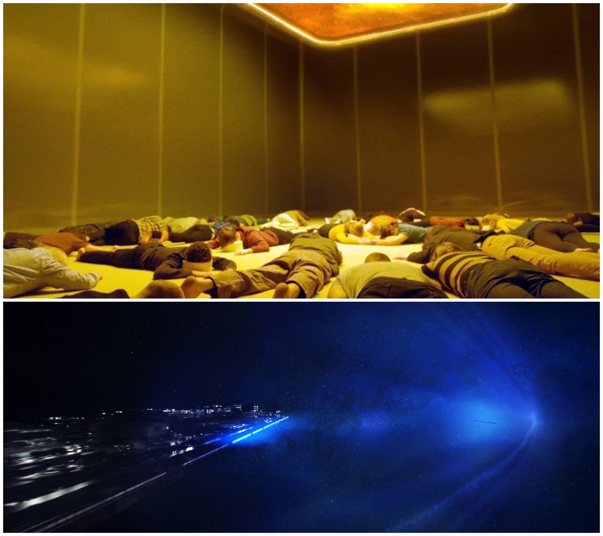 Top: Once the passengers come to grips with their existential crisis, greater numbers overuse the ship’s artificial intelligence, dubbed Mima, as an escape from their directionless lives. Bottom: The few external shots of deep space and our titular ship are impressive, begging the question as to how the directors might handle larger budgets in future genre films.