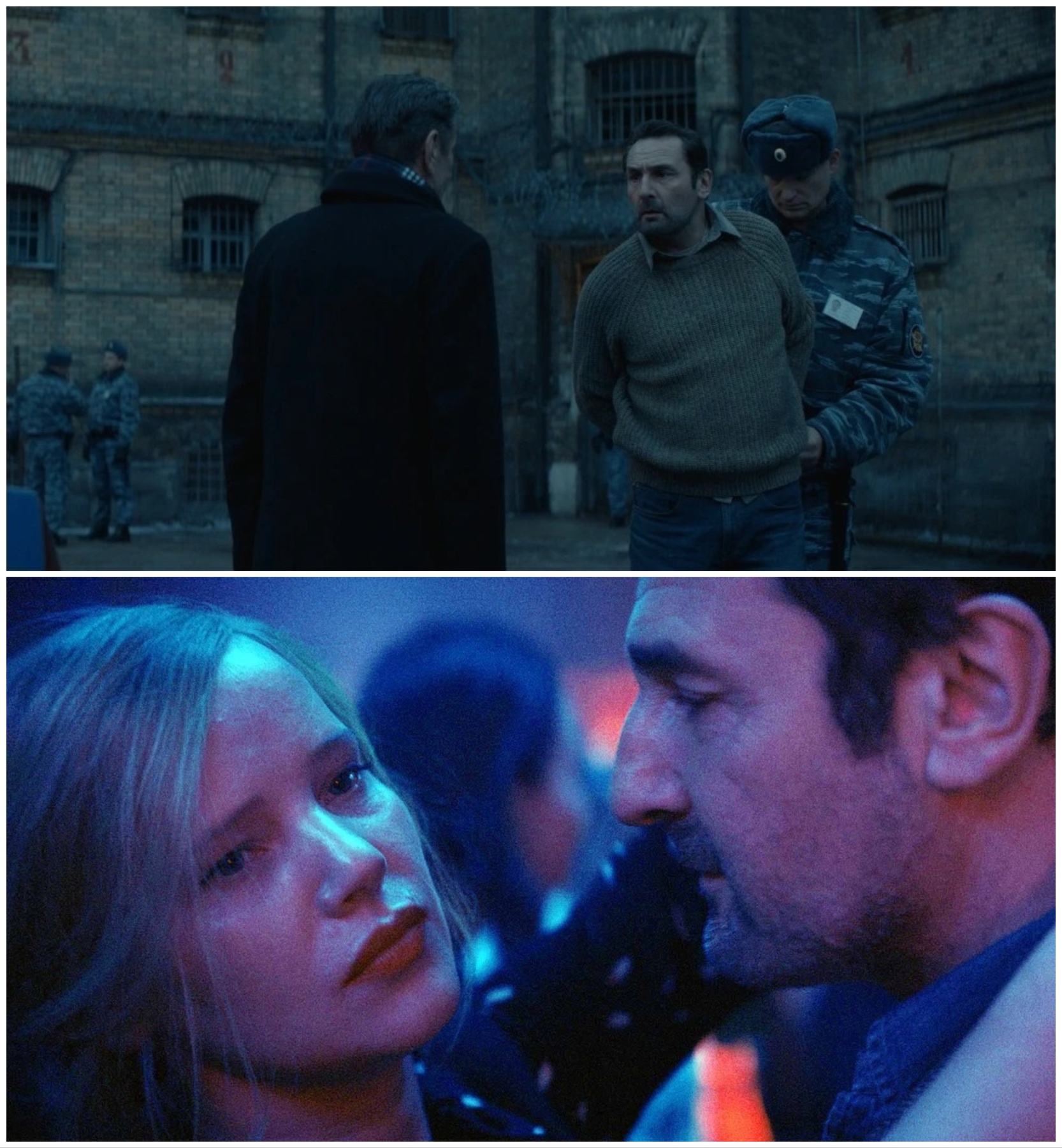 Gilles Lellouche is placed under arrest and sent to prison (top) after being caught committing multiple “crimes,” one of which is dancing in public with the daughter-in-law (Joanna Kulig; bottom) of a local Federal Security Service officer.