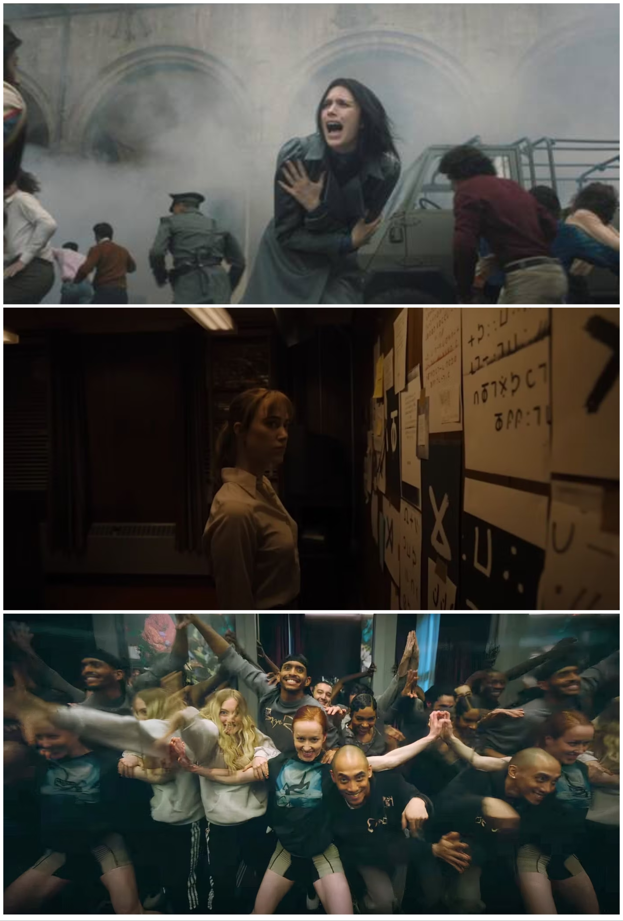 Top: Nell Tiger Free attempts to survive a brutal riot in 1970s Rome in The First Omen. Middle: Much of Longlegs is bathed in oppressive shadows, including here when Maika Monroe studies the Satanic code of Nicolas Cage’s serial killer. Bottom: A nightmarish demon conjures the spectres of Naomie Scott’s backup dancers in a key sequence at the end of the second act of Smile 2.