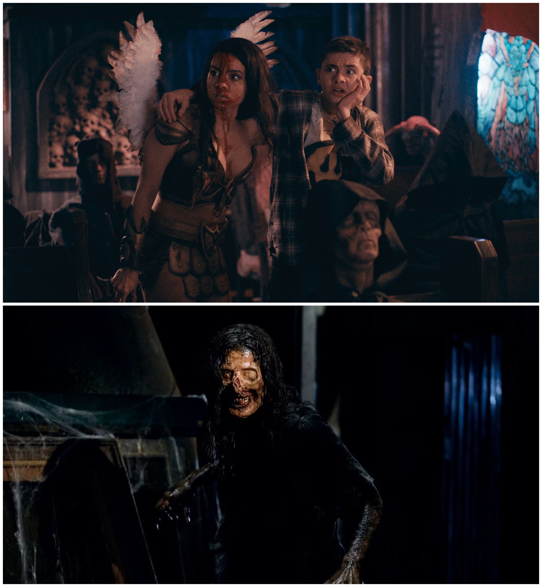 Top: Series final girl Lauren LaVera (left) and diegetic brother Elliott Fullam (right) get more than they bargained for in Terrifier 2. Bottom: Thornton’s Art the Clown isn’t the only nasty villain in these movies, as Samantha Scaffidi stars as a broken survivor turned possessed monster by Terrifier 3.