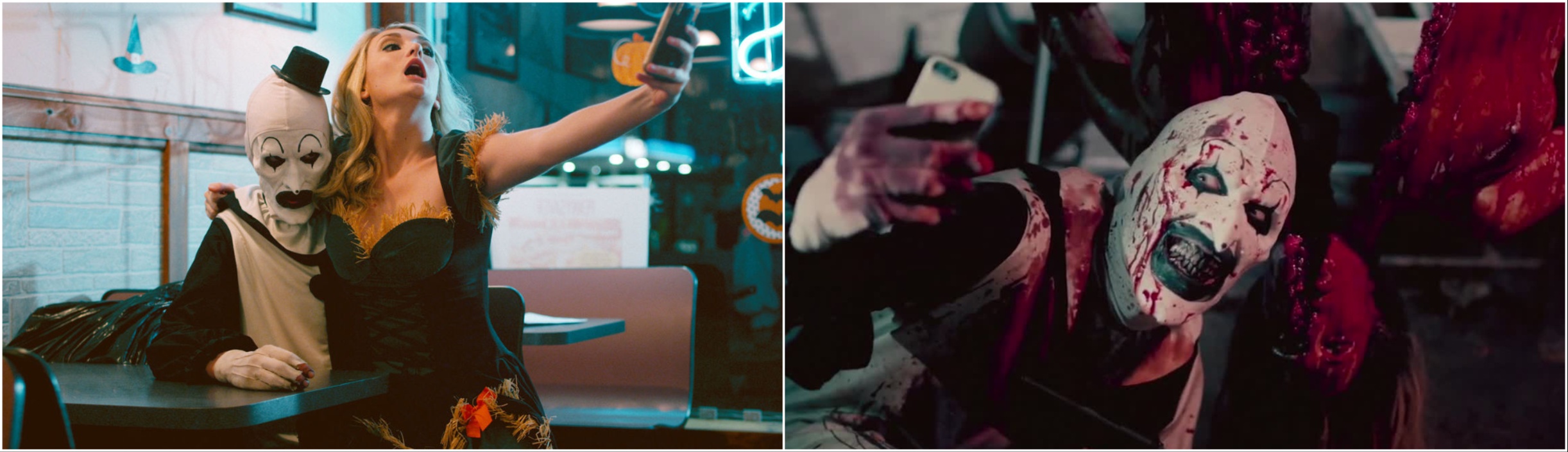 In the first Terrifier (2016), Catherine Corcoran grabs a selfie with David Howard Thornton (left), who later returns the favor (right).