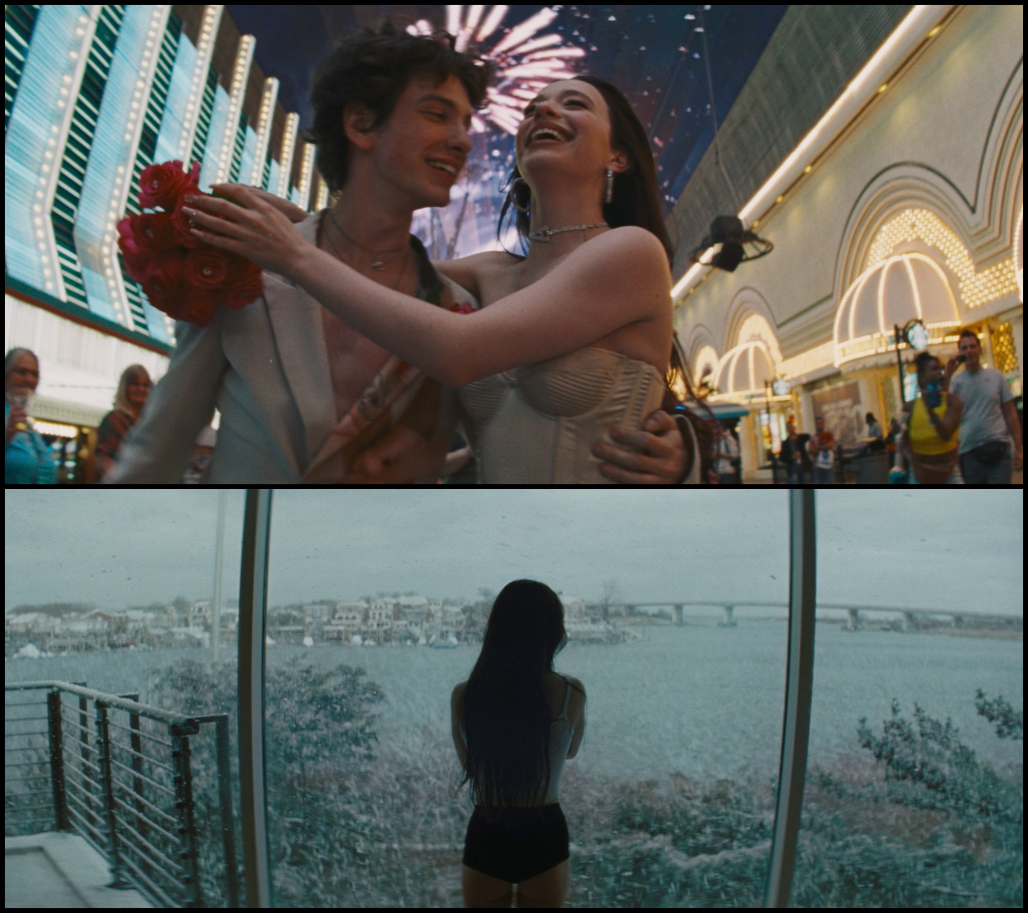 Top: Mikey Madison (right) and Mark Eydelshteyn (left) party it up after eloping in a Las Vegas wedding chapel in Act One. Bottom: In Act Three, a much more forlorn Madison gazes out the second floor windows of Eydelshteyn’s Brighton Beach mansion.