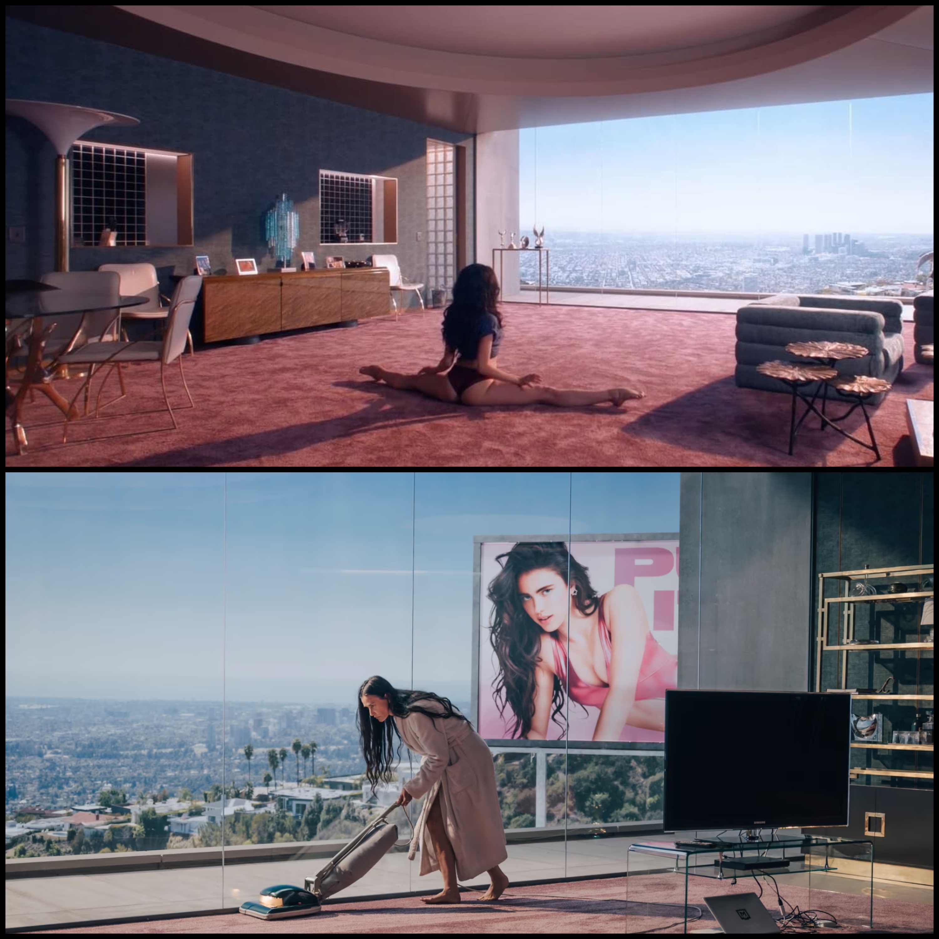 After injecting the titular drug into her system, our protagonist splits her time between the youthful, hedonistic lifestyle embodied by Margaret Qualley (top) and the increasingly reclusive, bitter persona of her original body as portrayed by Demi Moore (bottom). In the latter scenario, Qualley’s success (note the billboard) becomes a source of resentment rather than pride for Moore.