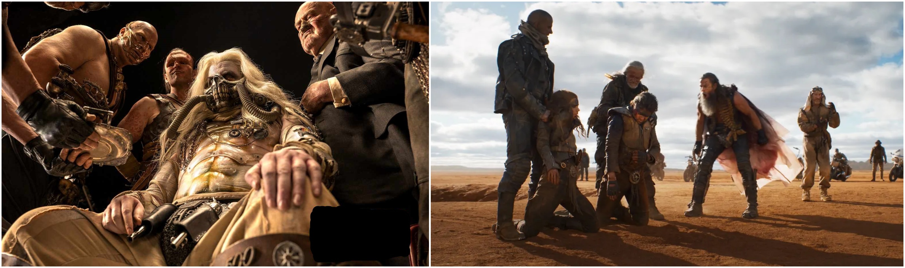 Left: All of the main villains from Fury Road return in some capacity in Furiosa, though some, like Immortan Joe (e.g. Lachy Hulme, center) are portrayed by different actors. Right: Chris Hemsworth (center right) plays an overblown, uncomplicated villain who ranks as one of the less interesting antagonists of the Mad Max franchise.