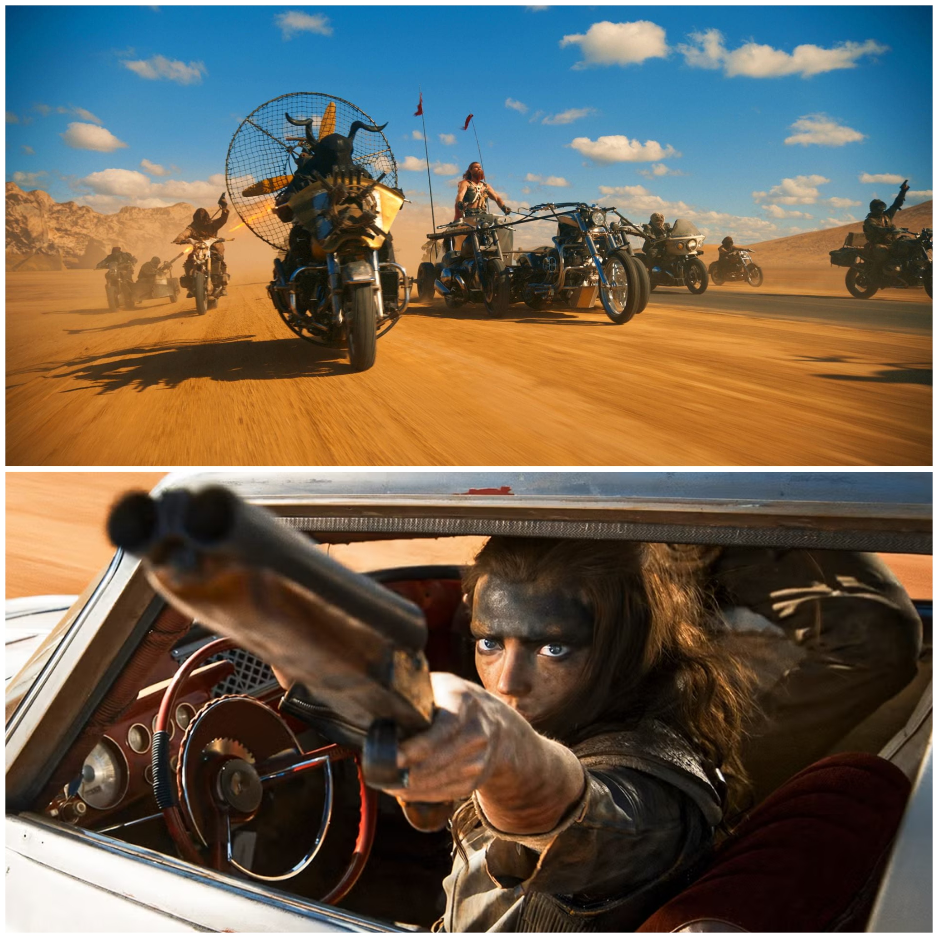 When Furiosa’s visual FX are limited to extensive color-grading with a modest number of elements on screen (top), or when the action is framed in medium to close-up shots (bottom), the post-apocalyptic setting works. Otherwise, the movie looks like a cartoon.