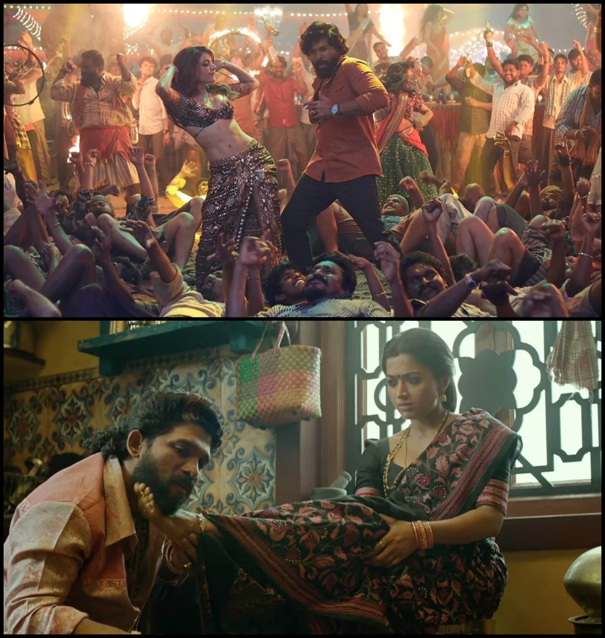 Though Pushpa (Allu Arjun) spends time with girls like Samantha Prabhu in passable item songs (“Oo Antava Oo Oo Antava“, top) across both movies, he occasionally acts in filler sequences with ostensible female lead Rashmika Mandanna (bottom).