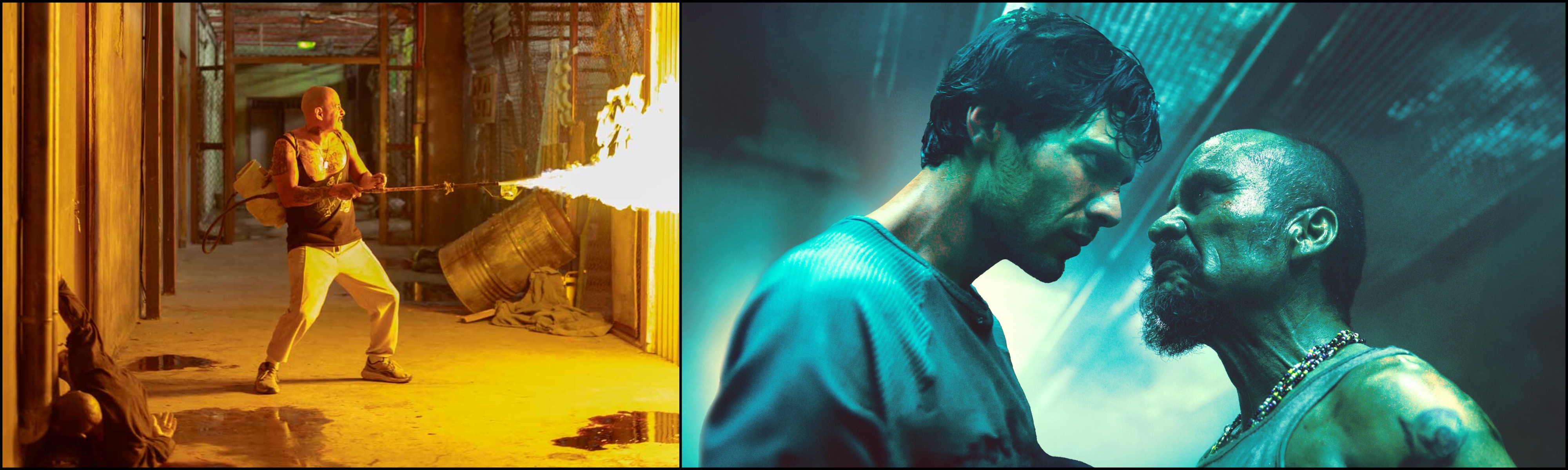 Left: Much of the visceral impact of Cell 211’s prison riots are muted thanks to obvious digital FX that look even worse in motion. Right: The heart of this prison drama is supposed to be the contentious relationship between lead Diego Calva (left) and costar Noé Hernández (right), yet it is crowded by too many extraneous subplots.
