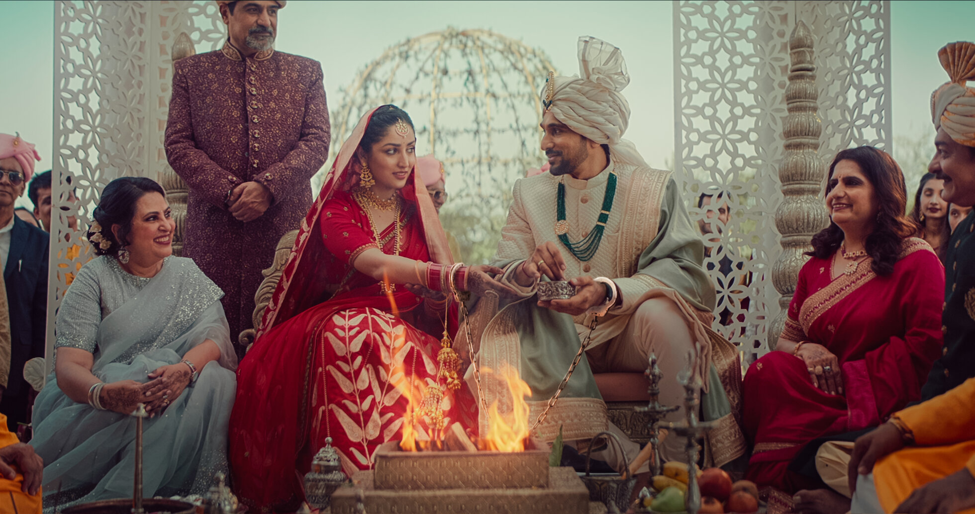 Leads Yami Gautam Dhar (center left) and Pratik Gandhi (center right) neither elope with a secret lover nor climax their story in matrimony in Dhoom Dhaam. Their arranged marriage, instead, is the film’s inciting incident.