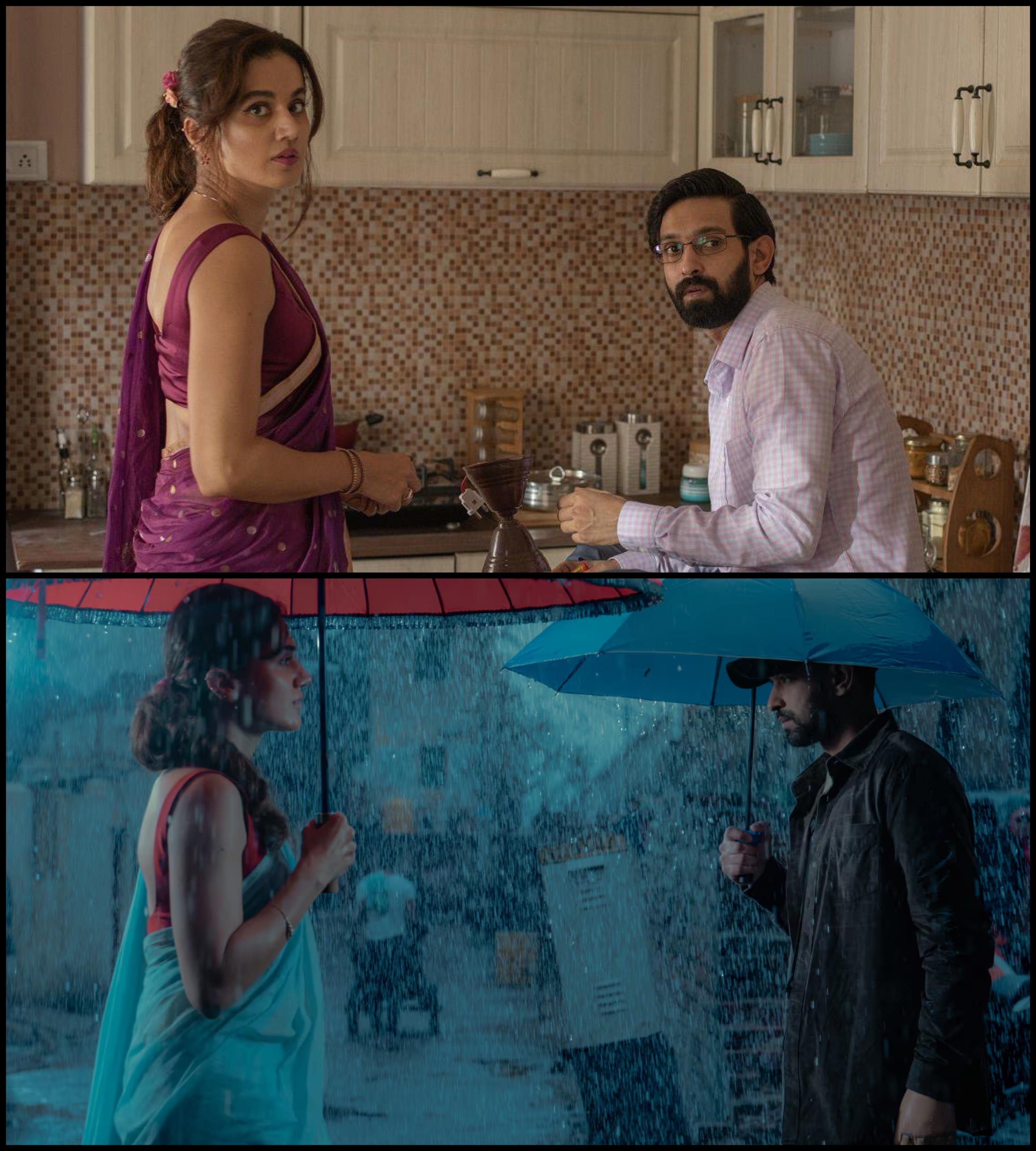 Taapsee Pannu and Vikrant Massey transition from a tense yet otherwise ordinary domestic relationship in the first Hasseen Dillruba (top) to a much weirder, let’s say “atypical” marriage in the sequel film (bottom).