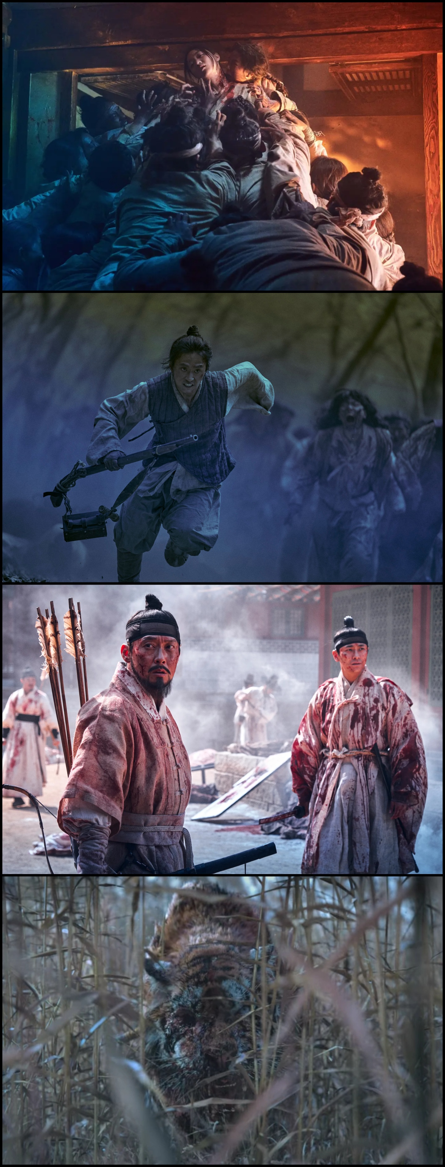 From top to bottom: (1) Ravenous undead feast on civilians in perhaps Kingdom’s most iconic shot; (2) Kim Sung-kyu sprints in front of a horde of zombies with a 17th century matchlock rifle; (3) lead Ju Ji-hoon (right) portrays the Joseon crown prince, who allies with nobleman and memorable costar Huh Joon-ho (left); (4) in Ashin of the North, a CGI tiger stalks multiple supporting castmembers.